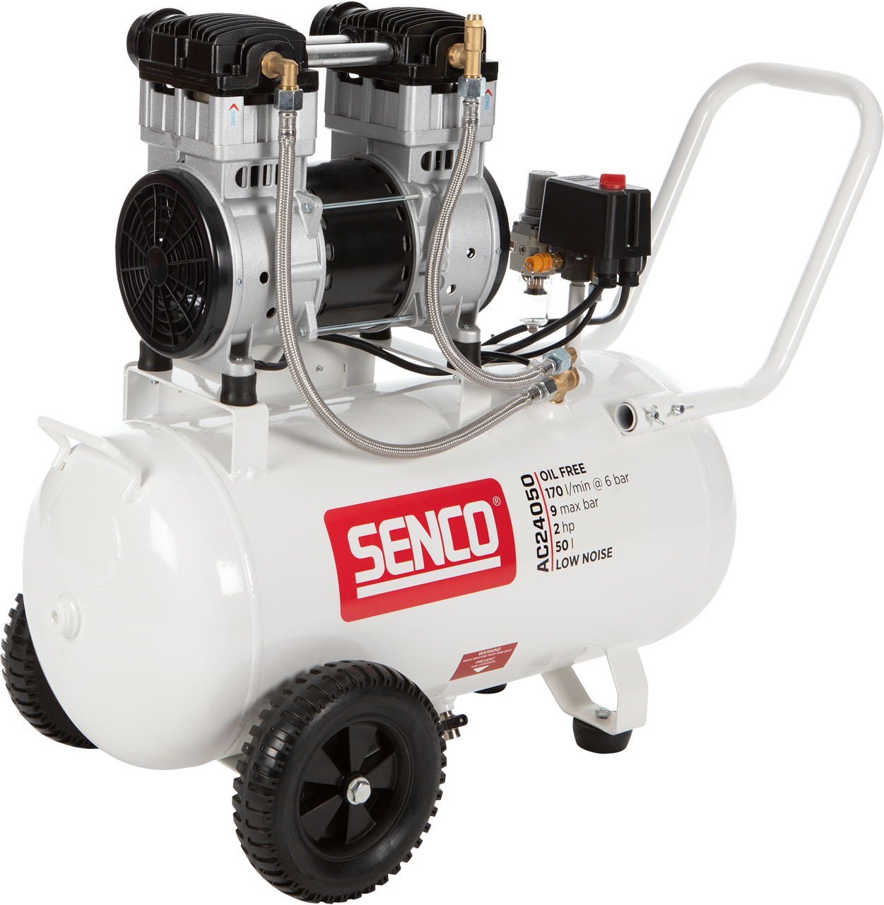 Senco AC24050 on ääneneristetty kompressori vaakasuoralla säiliöllä.