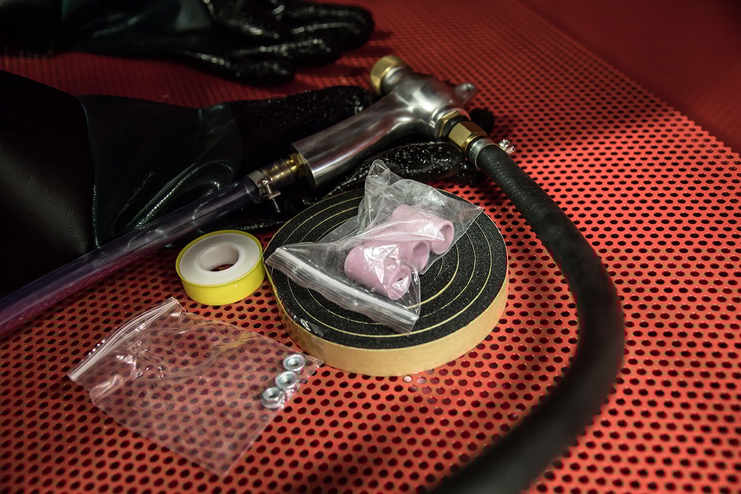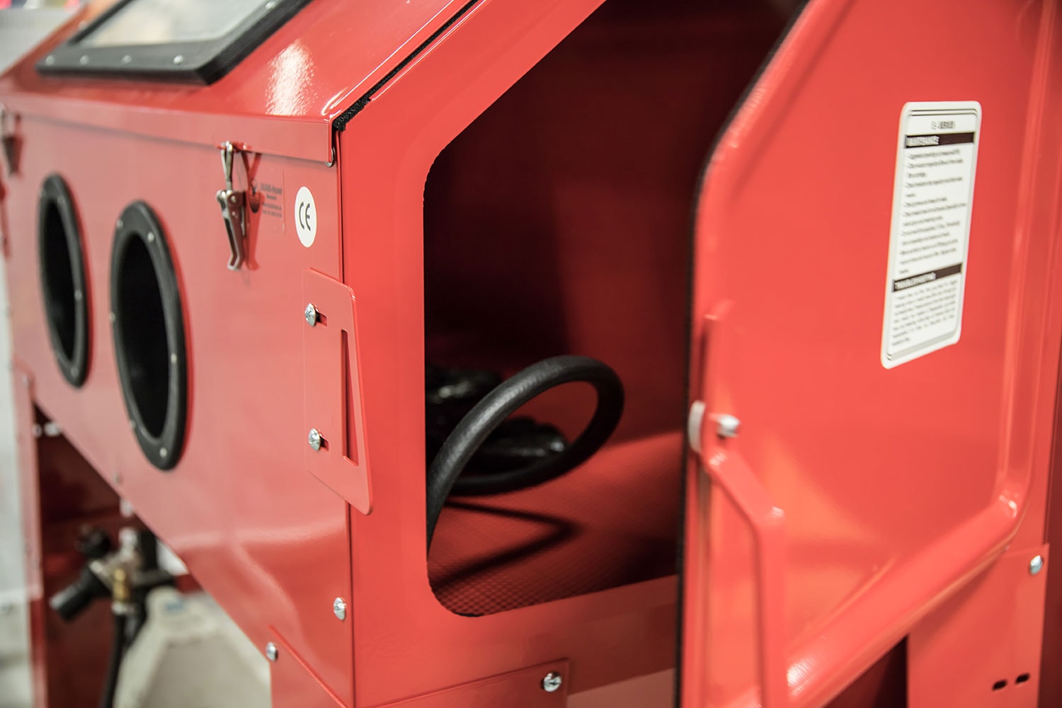 SBC 420 on ammattimainen hiekkapuhalluskaappi, jossa on karkaistu lasi-ikkuna ja suojakalvo näköikkunalle. Mukana tuuletin ja siihen liittyvä hiukkassuodatin, työpöytä, sisävalaistus, puhalluspistooli, pölytiivis käsine, jalkaventtiili ja alennusventtiili painemittarilla.