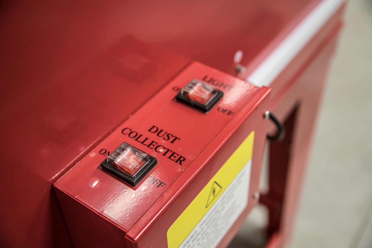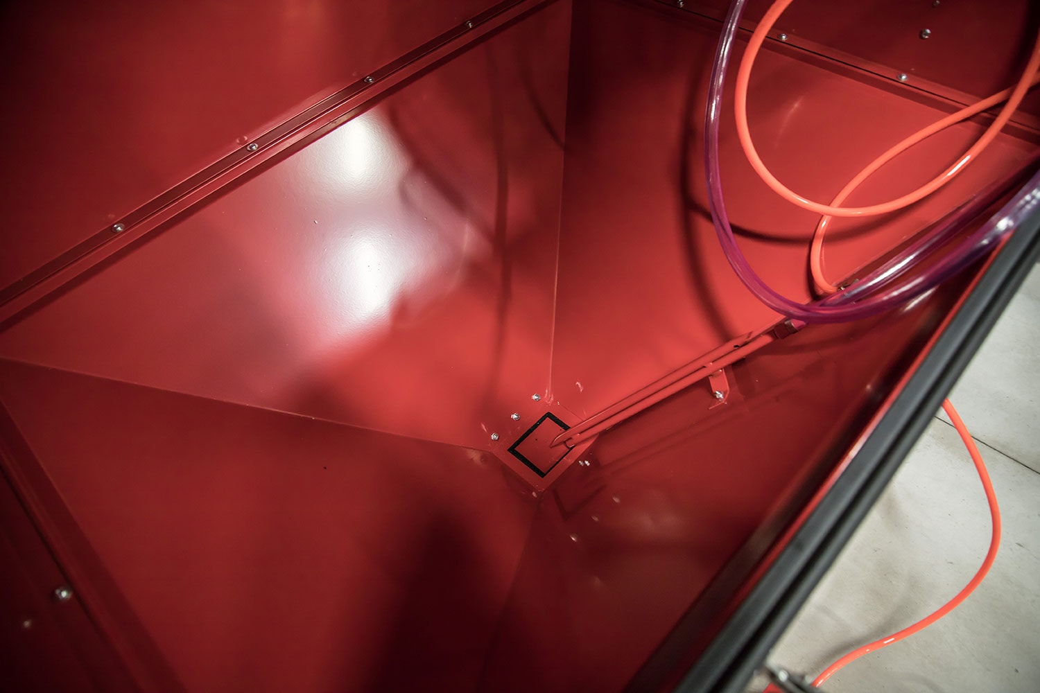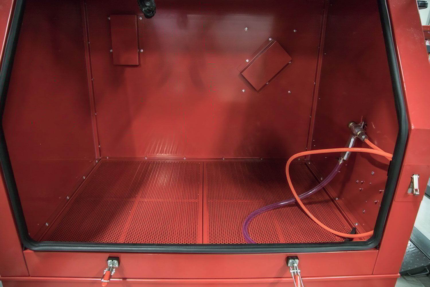 Mukana tuuletin ja siihen liittyvä hiukkassuodatin, työpöytä, sisävalaistus, puhalluspistooli, pölytiiviit käsineet, jalkaventtiili ja alennusventtiili painemittarilla.