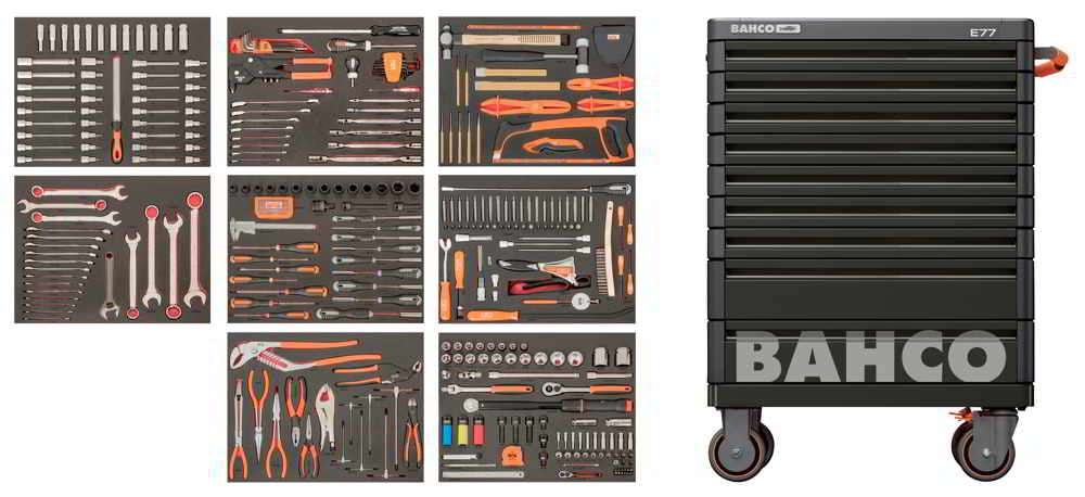 Etusivu / Autotalli ja verstas / Verstas ja säilytys / Työkalukärryt / Bahco työkaluvaunu 1477K9, musta, 9 laatikkoa ja 319 työkalua