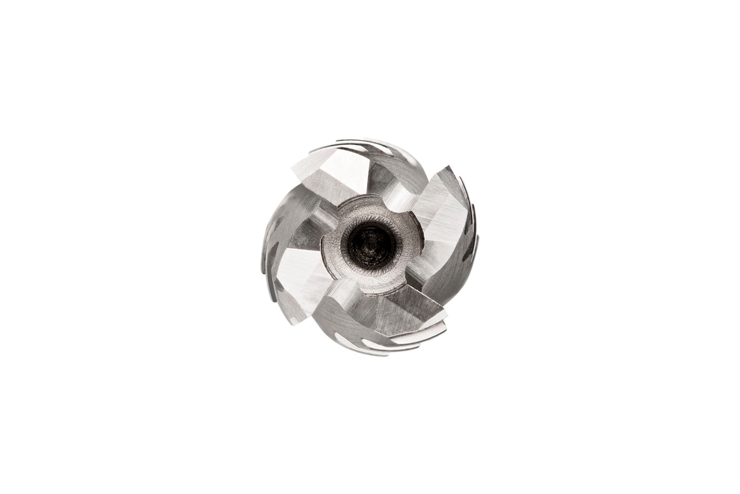 Lyhyt päätyjyrsin, jossa on NF-litteä lastunmurtaja ja 4 kpl DIN 844 K -standardin mukaisia inserttejä Weldon-varrella.