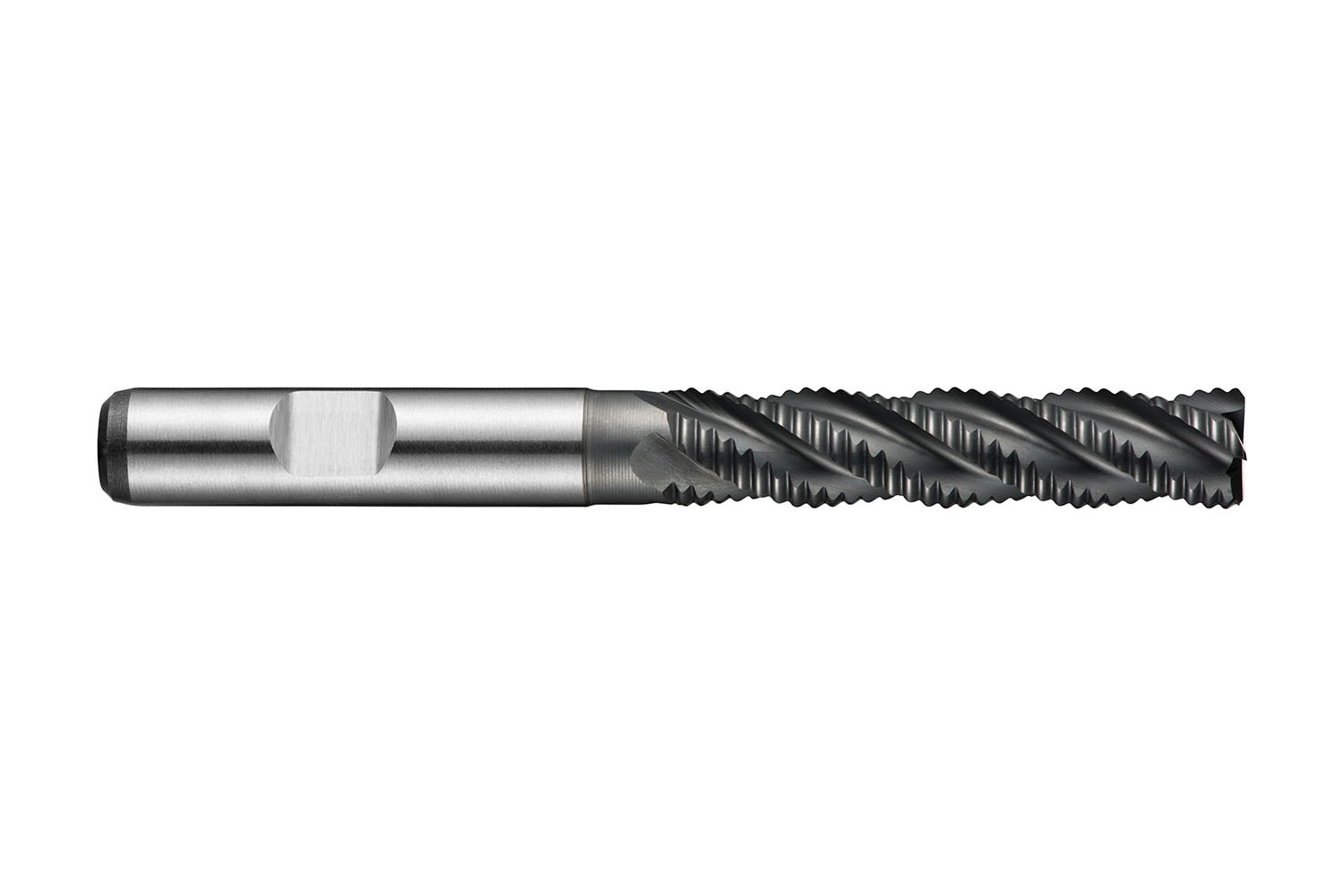 Pitkäkarainen jyrsin, jossa on NRA epäsymmetrinen lastunmurskain, jossa on pyöreä yläosa ja 4 kappaletta DIN 844 L -standardin mukaisia teriä, joissa on Weldon-varsi.
