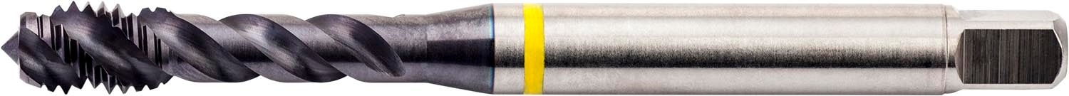 Keltainen Shark-kartiotappi C-kartiolla, jossa on 2-3xP-kartiopituinen pohjatappi ISO-Metricin karkealle kierteelle ja 6H-toleranssille.