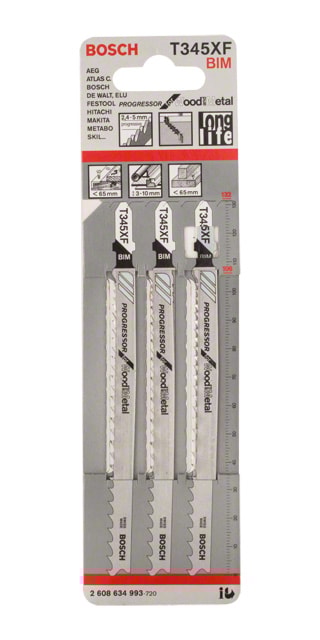 T 345 XF Progressor for Wood and Metal ‑pistosahanterä sahaa nopeasti ja suoraviivaisesti ohutta ja paksua puuta, jossa on metallia. Sen hammasgeometria portaattomasti kasvavalla hammasvälillä mahdollistaa käytön eri tiheyksisiin materiaaleihin. Lisäksi terän jyrsityt, haritetut hampaat on suunniteltu nopeisiin sahauksiin. BIM-materiaalista tehty, täysin kovetettu HSS-hammastus on yhdistetty hyvin elastiseen HCS-runkoon, minkä ansiosta terä sopii sellaisen puun sahaukseen, jossa on standardivahvuisia teräsosia. Terä on pitkä (132 mm) ja siinä on iso, kasvava hammasväli (2,4–5 mm), minkä ansiosta se sahaa metalliupotteista puuta 65 mm:n paksuuteen asti (esim. pehmeät naulat, pehmeät ruuvit ja pehmeät kiinnikkeet).