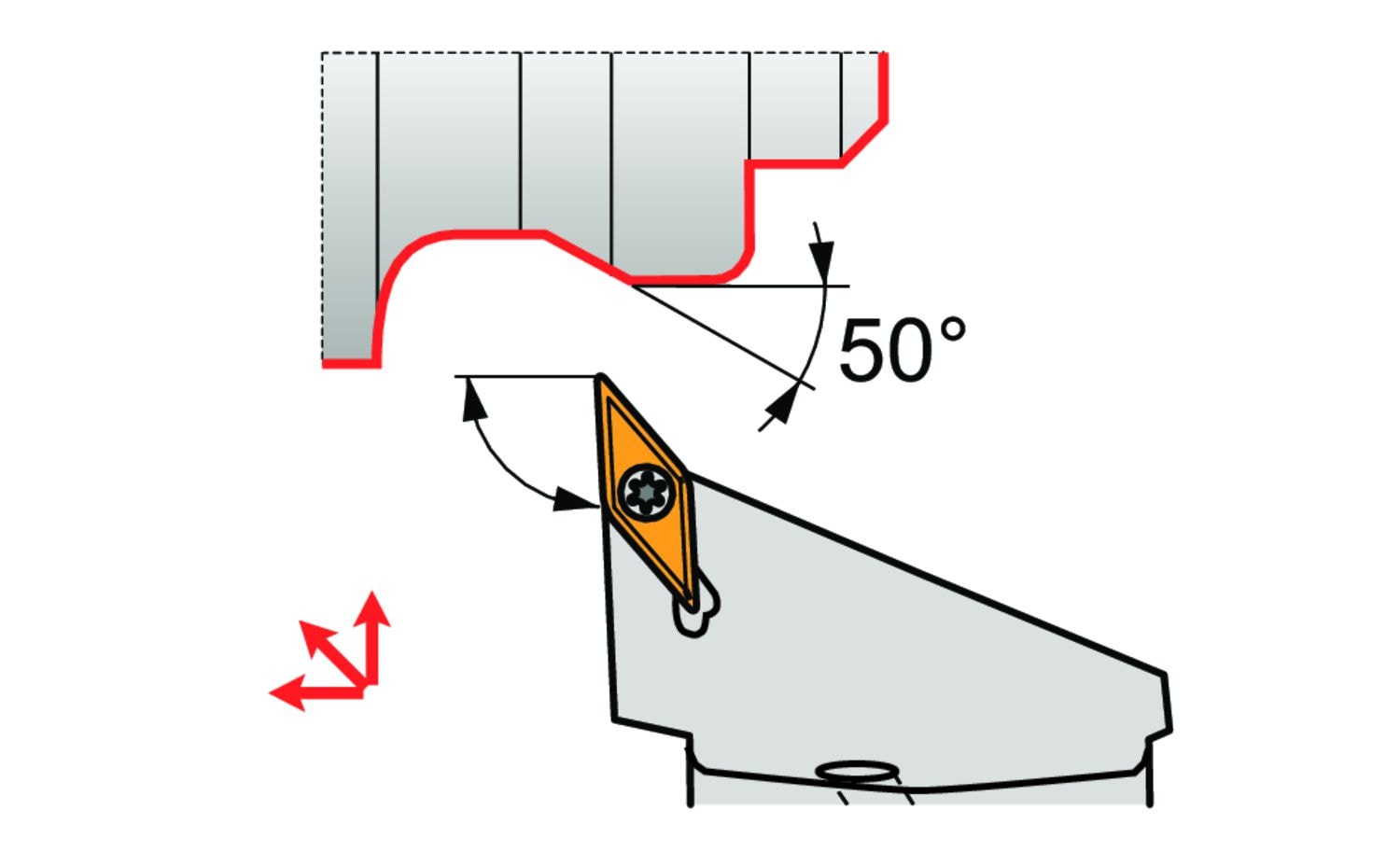Sorvausterän pidin ruuvipuristimella, joka pitää 35° rombimaisen positiivisen väännön, jonka sisähalkaisija on 6,35 mm, paksuus 3,18 mm (ISO-merkintä VB.. 1103.. tai VC.. 1103..), oikea 93° sivuleikkaus, siirretty varsi ISO 26623 (Polygon Varsi-liitäntä) koko C4, 27 mm leveys ja 50 mm ulkonemispituus pitkittäissorvaukseen, kopiosorvaukseen yhdessä tai useammassa suunnassa ja pääsorvaukseen olakkeella tai ilman