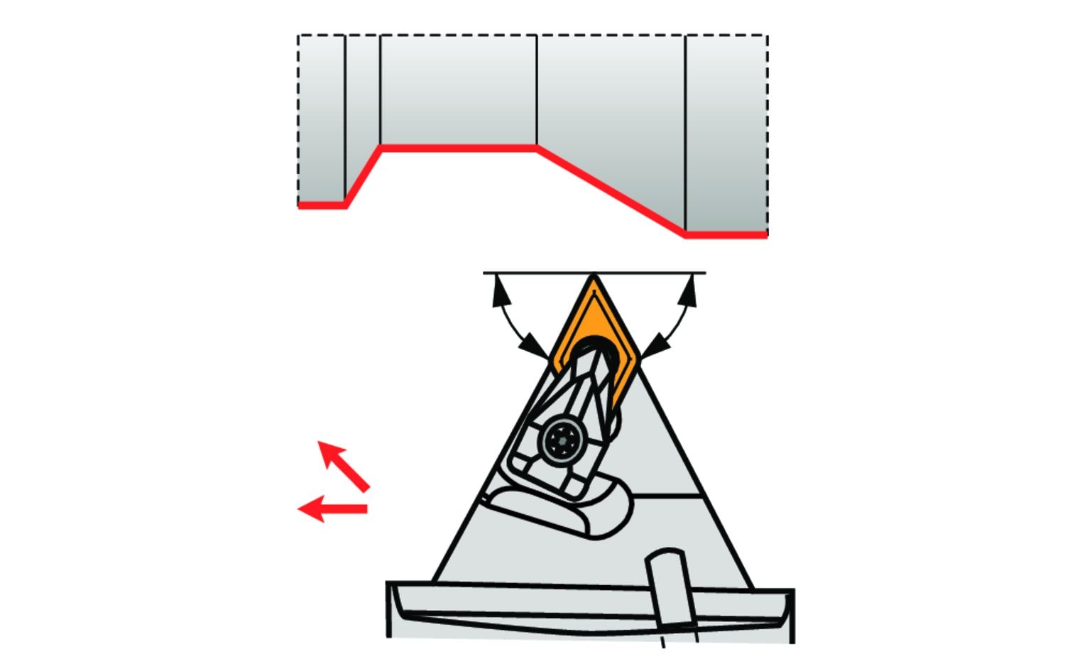 Sorvausterän pidin kaksoiskiinnityksellä 55° rombiselle negatiiviselle vaihtoterälle, jonka sisähalkaisija on 12,7 mm, paksuus 6,35 mm (ISO-merkintä DN.. 1506.. ), neutraali 62°30' sivuterä, suora varsi ISO 26623 (Polygonivarsiliitäntä) koko C6, 65 mm ulkonemalla kopiosorvaukseen yhteen tai useampaan suuntaan