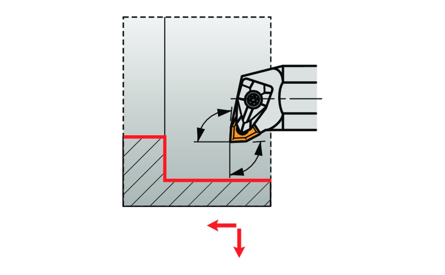 Sorvausvarsi, jossa on kaksinkertainen kiinnitys 80° trigon negatiiviselle vaihtopalalle, jonka sisähalkaisija on 12,7 mm, paksuus 4,76 mm (ISO-merkintä WN.. 0804.. ), oikea 95° sivuleikkaus, siirretty varsi, teräs jäähdytysreiällä, 25 mm halkaisija x 300 mm pitkä sisäpuoliseen konsorvaukseen ja sisäpuoliseen pituussorvaukseen olakkeella tai ilman