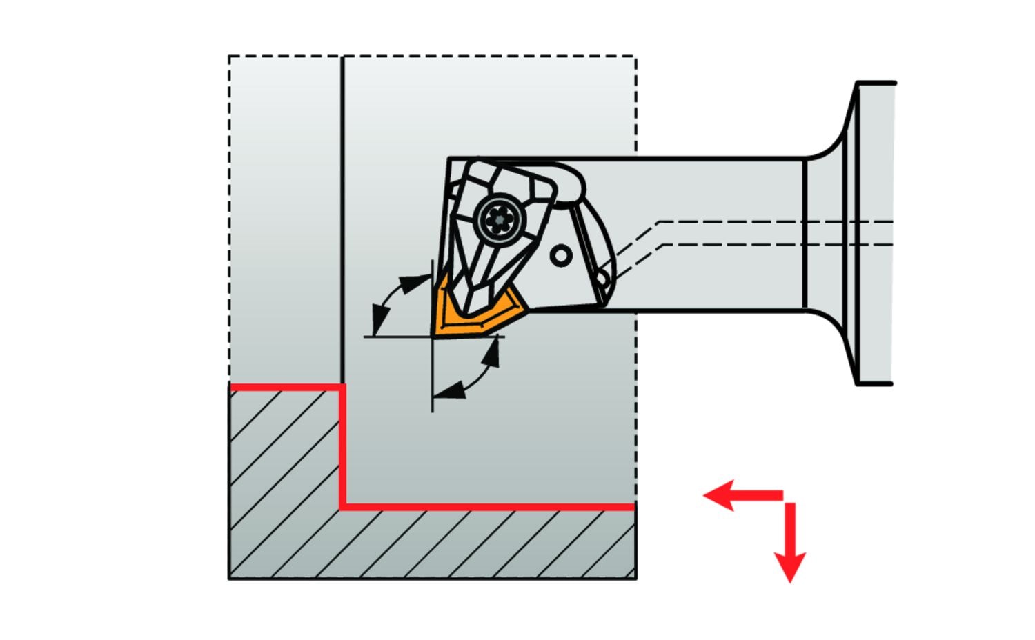 Sorvauspuomi kaksoiskiinnityksellä, joka pitää 80° trigon negatiivisen kääntöterän, jonka sisähalkaisija on 9,525 mm, paksuus 4,76 mm (ISO-merkintä WN.. 0604..), oikea 95° sivuterä, siirretty varsi ISO 26623 (Polygon Varsi-liitäntä) koko C4, 13 mm leveys ja 75 mm ulkonemispituus sisäiseen muotosorvaukseen ja sisäiseen pituussorvaukseen olkapäällä tai ilman
