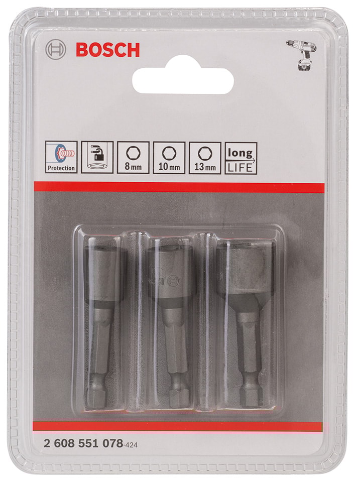 Etusivu / Konetarvikkeet ja käyttömateriaalit / Sähkötyökalujen tarvikkeet / Kärjet / Bosch Hylsysarja 8/10/13 mm, magneetti, 3-os.